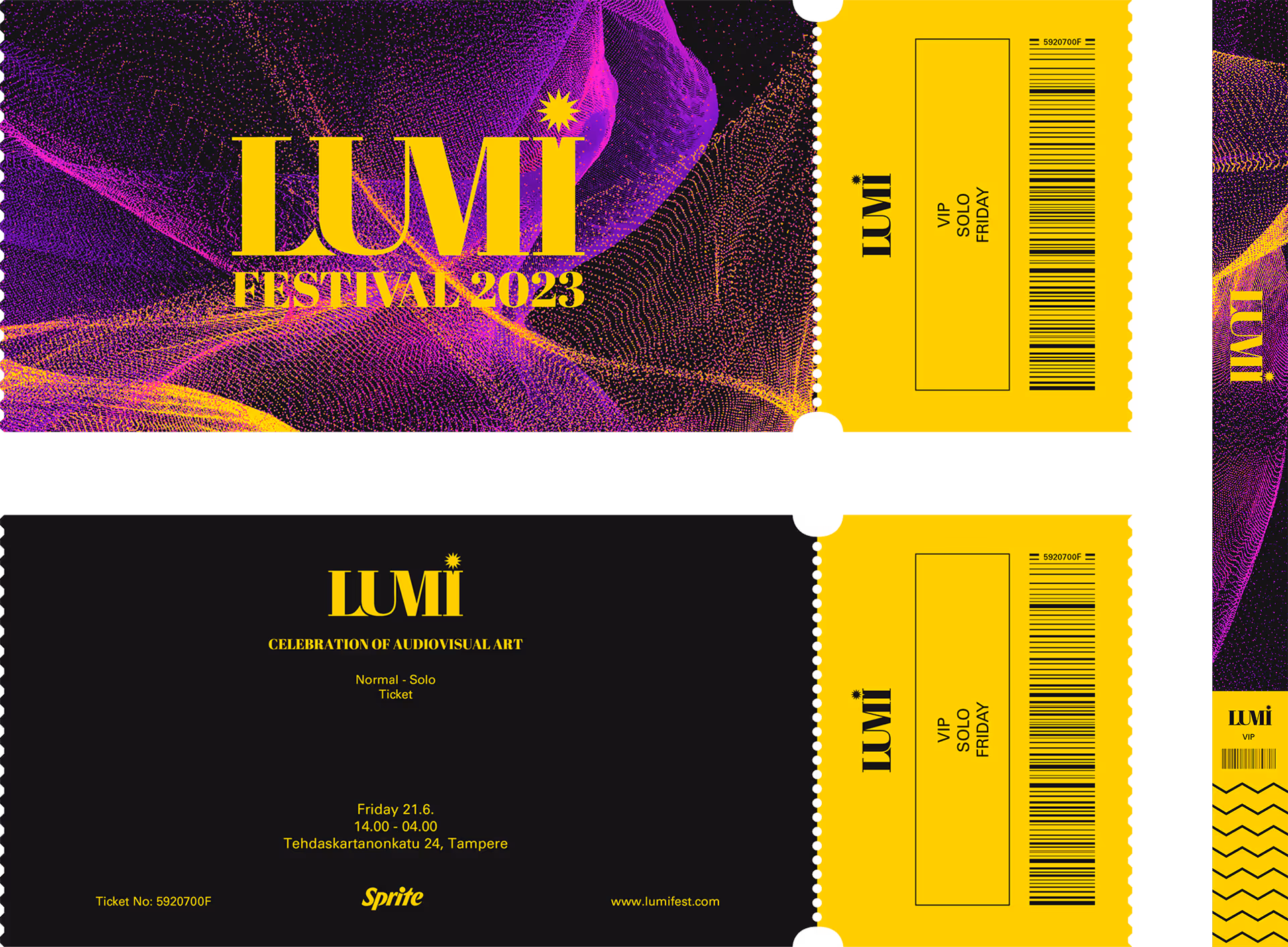 Visual identy project about "Lumi Festival", which is a conceptual festival to celebrate audiovisual art, inspired by Aavistus Festival. Its themes would be focused on experiments, experiences, and creating new connections. I built the visual identity around the generative art made in TouchDesigner. The generative nature of the visuals allows each ticket, bracelet, or any other piece of branding to be unique.